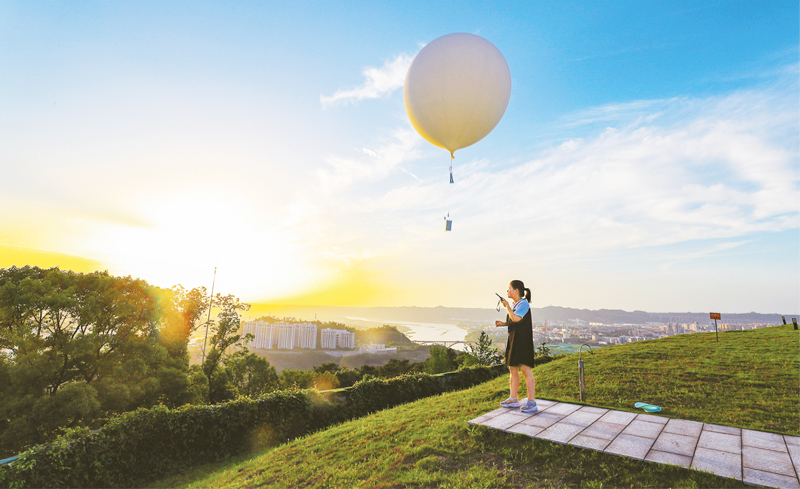 图为2020年6月3日,气象观测员在四川省宜宾市气象站释放探空气球。该气象站位于当地人造城市森林公园翠屏山山顶,海拔502.8米。在这个环境优美、空气清新的气象站里,气象观测员通过全面自动化地面气象观测系统记录气象情况并对收集到的数据处理传回分析,第一时间通过短信将最新天气预报发送至市民手机,以便当地群众即时安排工作与生活。 人民图片 庄歌尔/摄