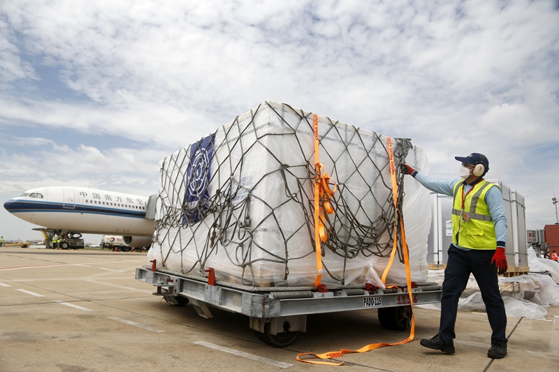 图为2021年7月22日,柬埔寨金边的机场工作人员搬运刚刚运抵的中国国药新冠疫苗。新华社发 披隆/摄