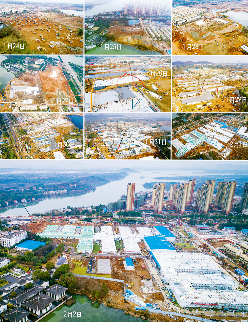 总建筑面积超过3万平方米,架设箱式板房近2000间,接诊区病房楼ICU俱全……火神山医院从开始设计到建成完工,历时10天。图为标注日期的拼版照片(无人机拍摄)。新华社记者 肖艺九/摄