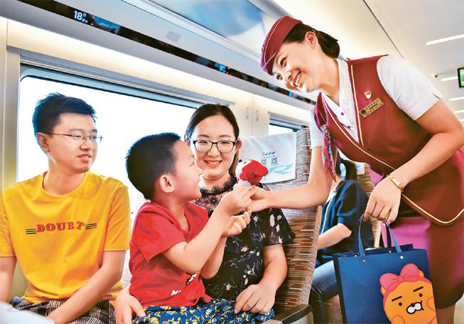 高铁作为我国现代化轨道交通建设的重大成果,推出了电子客票、网上订餐、静音车厢、智能交互等一系列服务举措,为广大人民群众提供了安全舒适便捷的出行体验。图为高铁乘务员与旅客互动交流。国铁集团宣传部供图
