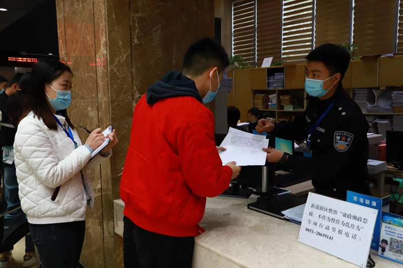 贵州省遵义市新蒲新区纪检监察工委聚焦营商环境的堵点痛点难点,组织纪检监察干部采用明察暗访的方式,定期对区政务服务大厅各办事窗口工作人员履行工作职责、遵守工作纪律等情况开展监督检查,严肃查处吃拿卡要行为,以有力监督推动营商环境持续优化,为经济社会健康发展保驾护航。图为2021年4月8日,该区纪检监察干部到服务大厅对窗口工作人员值班值守情况进行监督检查。贵州省纪委监委供图 刘镱/摄