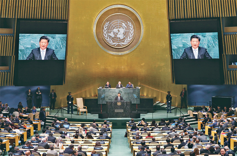 2015年9月28日,习近平总书记出席第70届联合国大会一般性辩论并发表重要讲话,郑重提出“和平、发展、公平、正义、民主、自由,是全人类的共同价值”。新华社记者 庞兴雷/摄