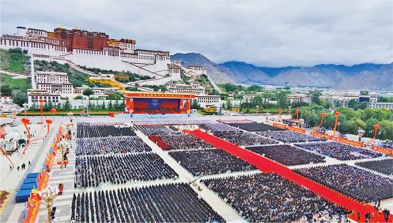 2021年8月19日,西藏各族各界干部群众2万多人欢聚在拉萨布达拉宫广场,热烈庆祝西藏和平解放70周年。新华社记者 孙瑞博/摄