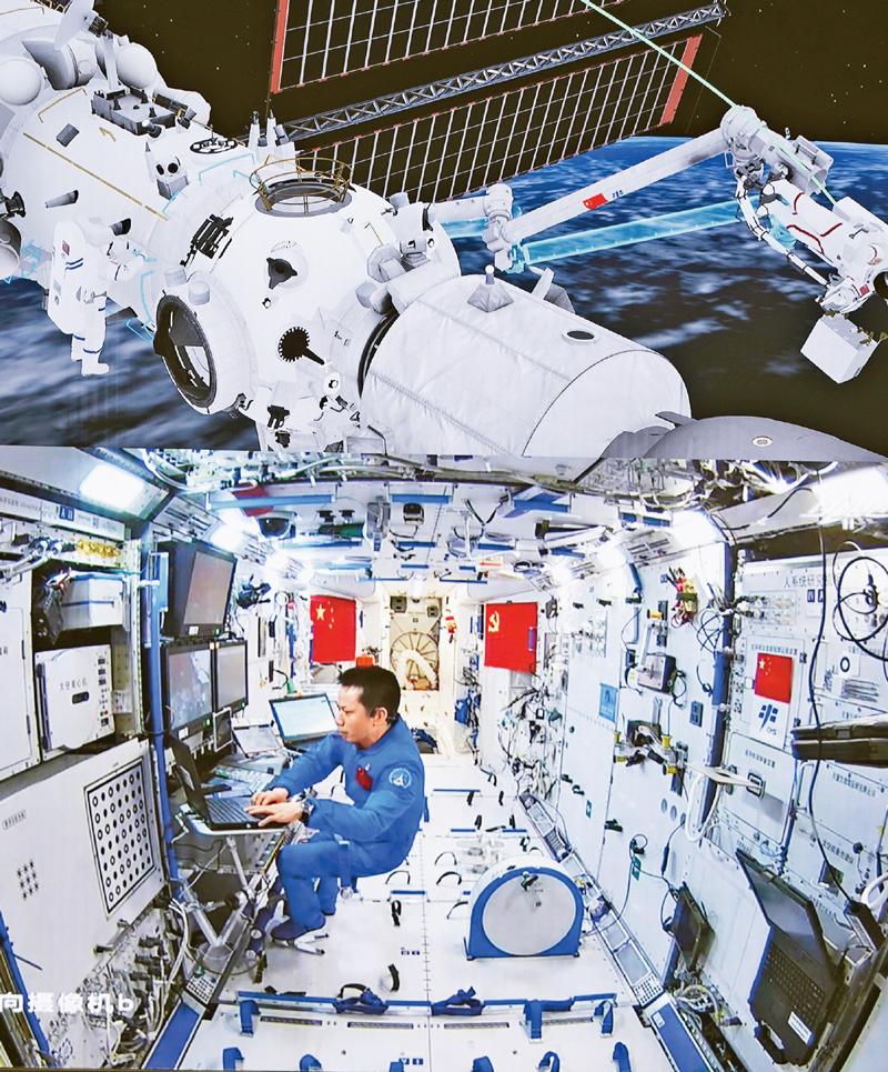 在长期的奋斗中,我国航天工作者铸就了“特别能吃苦、特别能战斗、特别能攻关、特别能奉献”的载人航天精神。上图为2021年8月20日,神舟十二号乘组两名航天员再次成功出舱。下图为在北京航天飞行控制中心大屏拍摄的神舟十二号乘组航天员汤洪波核心舱内的工作场景。新华社记者 田定宇/摄