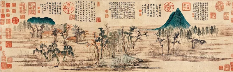 《鹊华秋色图》是元代画家赵孟頫在浙江为友人周密(祖籍山东)浓烈的思乡之情所打动而作的山水画。整个画面默写了济南附近黄河两岸的鹊山和华不注山,在画面的左边是用披麻皴画出凝重深静,浑然一体的鹊山,右边是用荷叶皴画出主脉分明,峻拔耸天的华不注山,两山之间百草丰茂,树丛千姿,水村草屋,渔人家禽散落在曲洲浅滩周边,树木上有几点红叶,巧妙地点出了“秋色”之景。实地考察《鹊华秋色图》现场,人们会惊奇地发现,700多年以来,鹊山及山脚下的村舍、树丛和浅滩的整体景观基本没有变化。可以说,这是中国美术史上从“对景写生”到“默写山水”的经典作品。