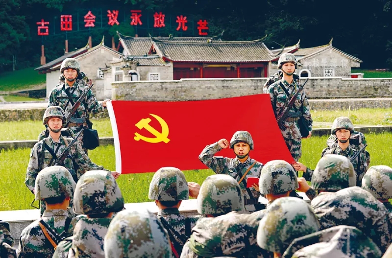 1929年12月,中国共产党红军第四军第九次代表大会在福建省上杭县古田召开。古田会议确立了思想建党、政治建军的根本原则,对人民军队的建设产生了深远影响。图为某部队官兵在古田会议旧址前庄严宣誓,赓续红色血脉,担当强军重任。姚安泉/摄