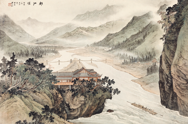 习近平总书记指出,实现中华民族伟大复兴是一项光荣而艰巨的事业,需要一代又一代中国人共同为之努力。新中国成立后,面对社会主义建设热潮,山水画家们纷纷走出画室,把工业、农业、水利、交通等各条战线的生产建设与山水风光融汇成祖国大好河山的新景观,热情讴歌建设社会主义现代化的艰苦奋斗、有力鼓舞中国人民的劳动热情。“三峡画派”创始人岑学恭的《灌县都江堰》,就是这方面的优秀代表。