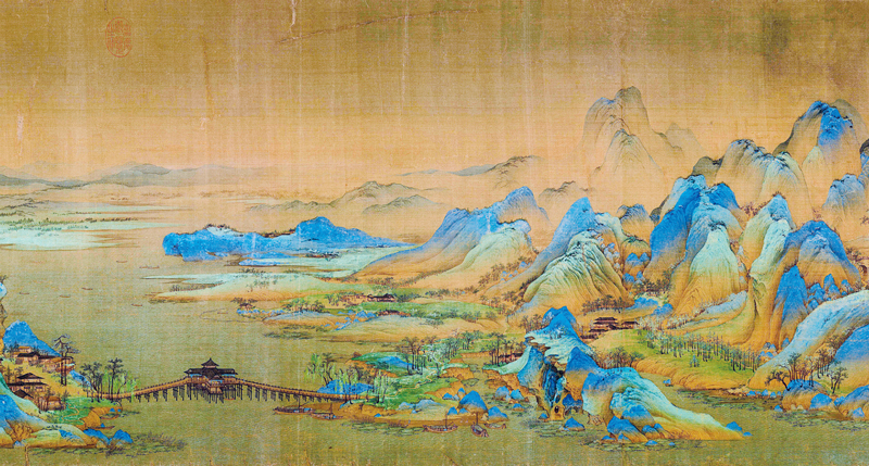 《千里江山图》是中国美术史上唯一以一幅画而名垂千古的北宋天才画家王希孟之鸿篇杰作,为中国十大传世名画之一。该画作为长卷形式,画面细致入微,烟波浩渺的江河、层峦起伏的群山构成了一幅气韵神妙的山水图,渔村野市、水榭亭台、茅屋草舍、水磨长桥穿插着捕鱼、驶船、游玩、赶集,动静相宜恰到好处,在人物的刻画上也极其精细入微,神态栩栩如生。画作以江山天下的视角描绘了我国辽阔疆域和平繁荣的山水景象,与中华民族中道平和、天下大同的审美追求一以贯之。同时,文化审美与“江山德治”高度契合,深刻蕴含着“明理崇德”的高尚社会精神风貌。