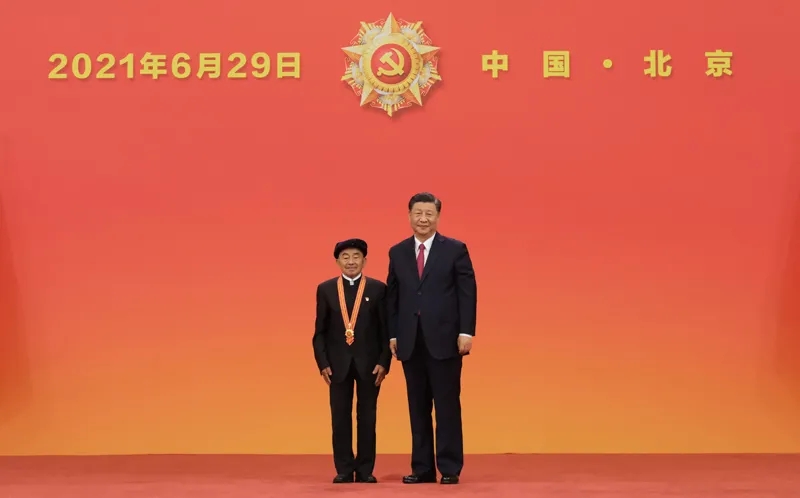 2021年6月29日,庆祝中国共产党成立100周年“七一勋章”颁授仪式在北京人民大会堂金色大厅隆重举行。中共中央总书记、国家主席、中央军委主席习近平向“七一勋章”获得者黄大发颁授勋章。 新华社记者 李学仁/摄