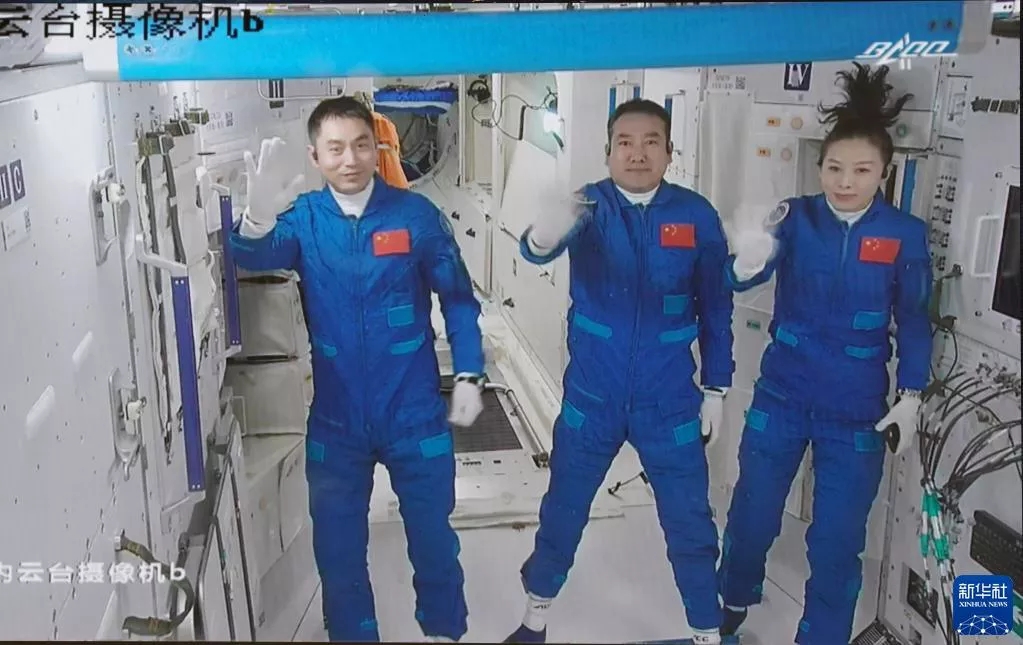 2021年10月16日在北京航天飞行控制中心拍摄的进驻天和核心舱的航天员翟志刚(中)、王亚平(右)、叶光富向全国人民挥手致意的画面。新华社记者 田定宇/摄