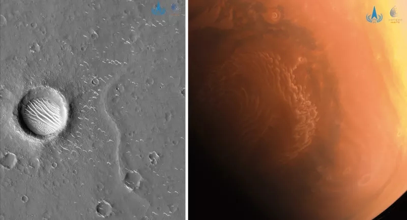 2021年3月4日,国家航天局发布3幅由我国首次火星探测任务“天问一号”探测器拍摄的高清火星影像图。左图为其中一幅全色图像,由高分辨率相机在距离火星表面约330千米至350千米高度拍摄,分辨率约0.7米,成像区域内火星表面小型环形坑、山脊、沙丘等地貌清晰可见;右图为彩色图像,由中分辨率相机拍摄,画面为火星北极区域。 新华社发 国家航天局供图