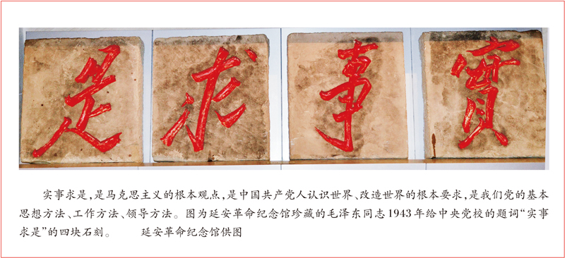 1941年5月19日,毛泽东同志在延安高级干部会议上作《改造我们的学习》的报告时,对实事求是作了精辟阐述:“‘实事’就是客观存在着的一切事物,‘是’就是客观事物的内部联系,即规律性,‘求’就是我们去研究。”同年底,中央党校副校长彭真请毛泽东同志为中央党校制定一个校训,毛泽东同志说:“实事求是,不尚空谈。”1943年11月,中央党校全校师生自己动手,修建了一座占地1300平方米的大礼堂。毛泽东同志高兴地写了“实事求是”四个大字。之后,这四个大字被刻在四块方石上,镶嵌在礼堂的正门上方。