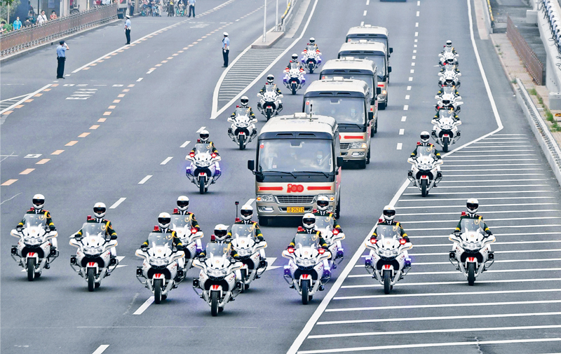 致敬,向最闪亮的星!图为“七一勋章”获得者集体乘坐礼宾车,由国宾护卫队护卫前往人民大会堂。新华社记者 翟健岚/摄