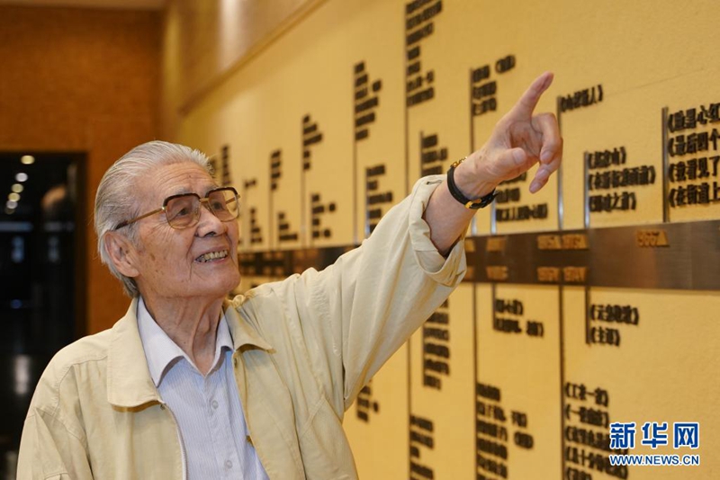 蓝天野在北京人民艺术剧院戏剧博物馆向记者指出曾出演的剧目(2021年6月16日摄)。新华社发 缑宇/摄