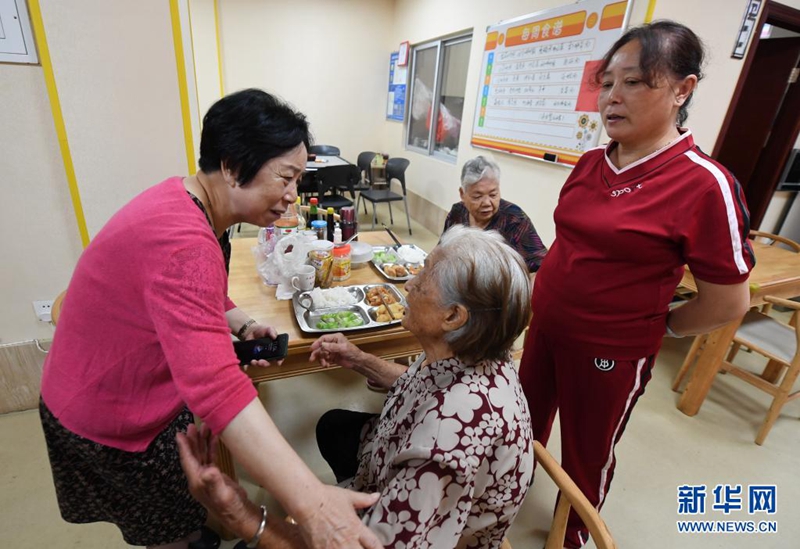 林丹(左一)在社区居家养老服务中心向徐佩英老人了解饮食健康情况(2021年6月23日摄)。新华社记者 林善传/摄