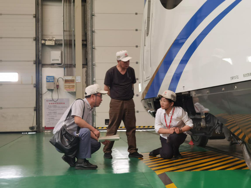 参加2021年“中国一日·工业兴国”活动的作家在中车株机公司城轨事业部调试车间采访。中国作家协会供图