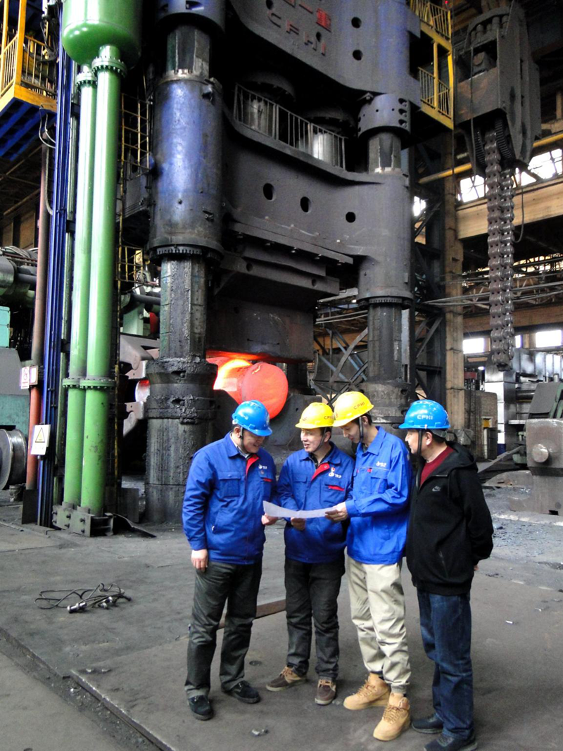 作家与中国一重的全国劳动模范、“大国工匠”荣誉获得者刘伯鸣在万吨水压机前交流。中国作家协会供图