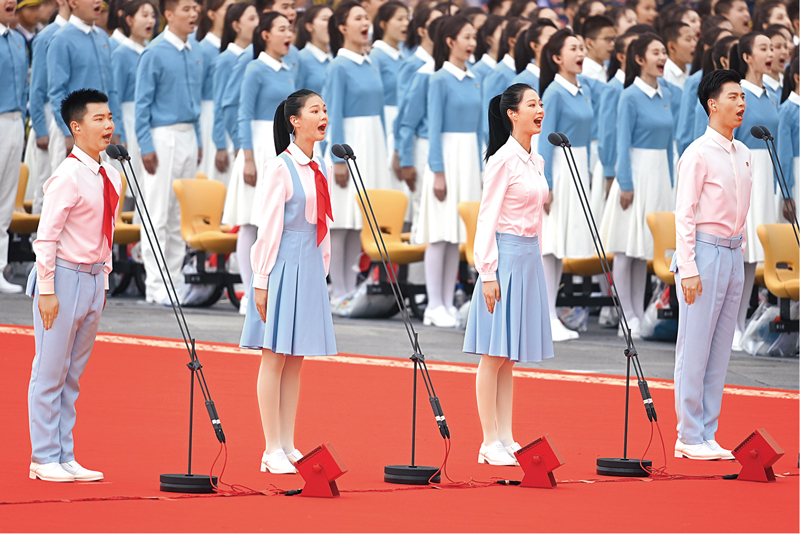 2021年7月1日上午,庆祝中国共产党成立100周年大会在北京天安门广场隆重举行。这是共青团员和少先队员代表集体致献词。新华社记者 李尕/摄
