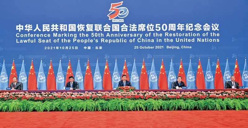 2021年10月25日,国家主席习近平在北京出席中华人民共和国恢复联合国合法席位50周年纪念会议并发表重要讲话。 新华社记者 李学仁/摄