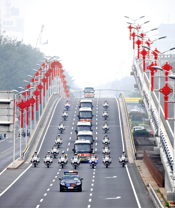 2021年6月29日,庆祝中国共产党成立100周年“七一勋章”颁授仪式在北京人民大会堂金色大厅隆重举行。这是“七一勋章”获得者集体乘坐礼宾车,由国宾护卫队护卫前往人民大会堂。 新华社记者 翟健岚/摄