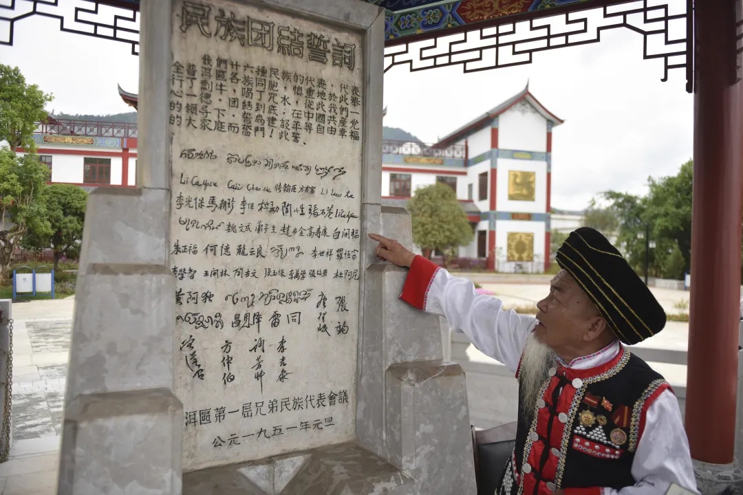 “从此我们一心一德,团结到底,在中国共产党的领导下,誓为建设平等自由幸福的大家庭而奋斗……”在云南省普洱市宁洱哈尼族彝族自治县民族团结园内,有块1951年立下的民族团结誓词碑,上面刻有当时多位民族代表立誓后,用汉语、傣语、拉祜语写下的签名,这块碑被誉为“新中国民族团结第一碑”。图为建碑的参与者和见证者,哈尼族老人方有富讲述团结碑的历史。中新社记者 刘冉阳/摄