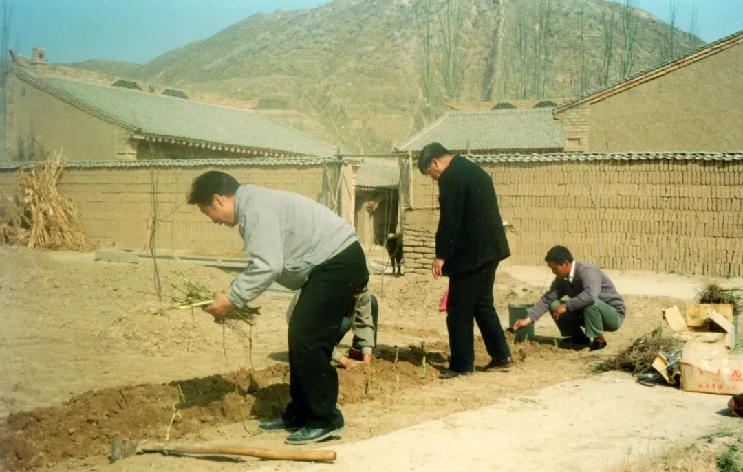 1997年4月,林占熺(左一)带领科研团队首次在宁夏彭阳县试种菌草(资料照片)。