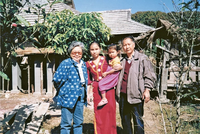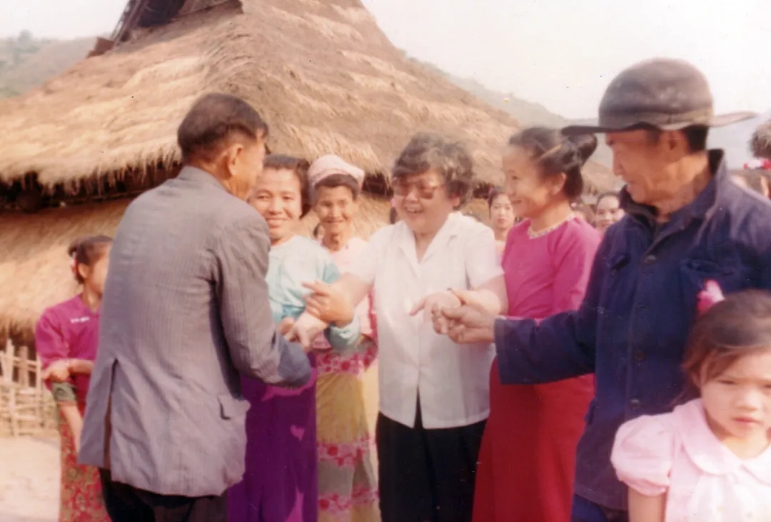 图为1994年11月,李桓英(左一)在当地工作人员(右一)的陪同下回到曼喃醒村追踪监测,与治愈的麻风病患者及其生育的健康后代合影。 北京市委宣传部供图