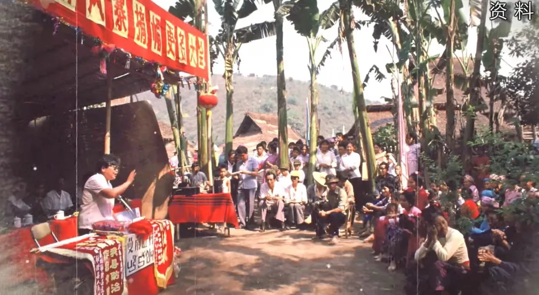 1990年4月,云南省勐腊县举行了麻风寨摘帽更名大会,李桓英(左一)在会上发言。 北京市委宣传部供图