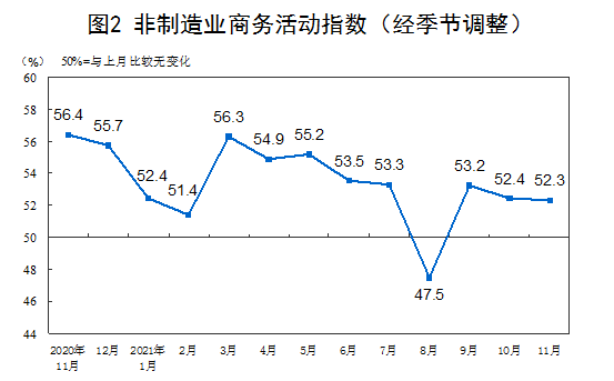 11月份,非制造业商务活动指数为52.3%,比10月略降0.1个百分点,继续高于临界点,非制造业总体保持稳定恢复。