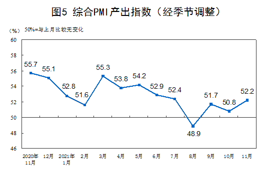 11月份,综合PMI产出指数为52.2%,比10月上升1.4个百分点,表明我国企业生产经营活动总体扩张步伐有所加快。