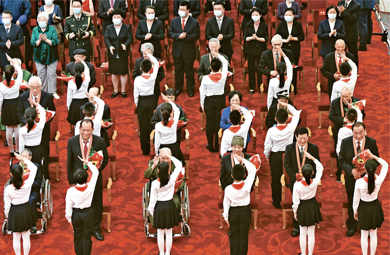 2021年6月29日,庆祝中国共产党成立100周年“七一勋章”颁授仪式在北京人民大会堂金色大厅隆重举行。这是少先队员向勋章获得者献花,敬礼致意。新华社记者 高洁/摄