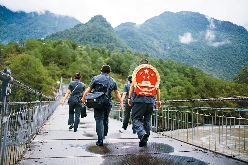 云南省怒江傈僳族自治州98%以上的面积是高山峡谷,交通不便,法官们经常背着国徽攀高山、过索桥、躲落石、钻老林,为群众进行法律服务。图为贡山县人民法院法官邓兴背着国徽与同事们跨过怒江(2019年8月30日摄)。新华社记者 江文耀/摄