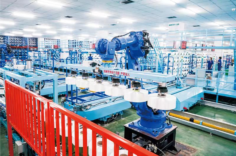 近年来,江苏省苏州市吴江区大力推进制造业智能化改造和数字化转型。图为2021年5月14日,位于吴江区盛泽镇的恒力化纤工业丝智能车间内,机器人在自动作业。 新华社记者 李博/摄