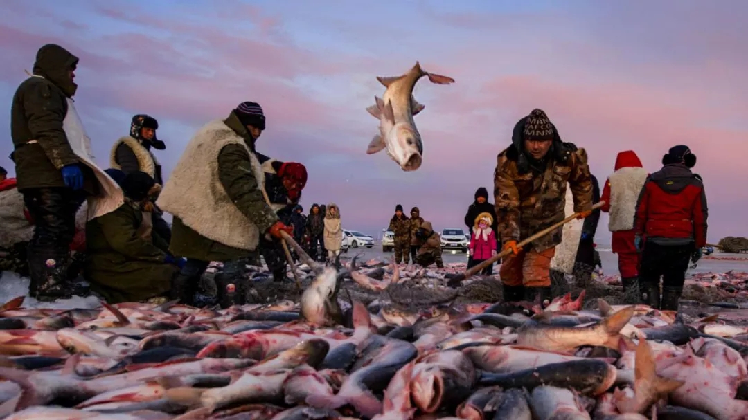 近年来,来自全国各地的游客走进查干湖冰天雪地的晶莹世界,玩冰雪、品鲜鱼,感受千年渔猎文化魅力,观赏冰湖腾鱼盛景。图为2022年1月2日,查干湖冬捕现场。 吉林省委宣传部供图