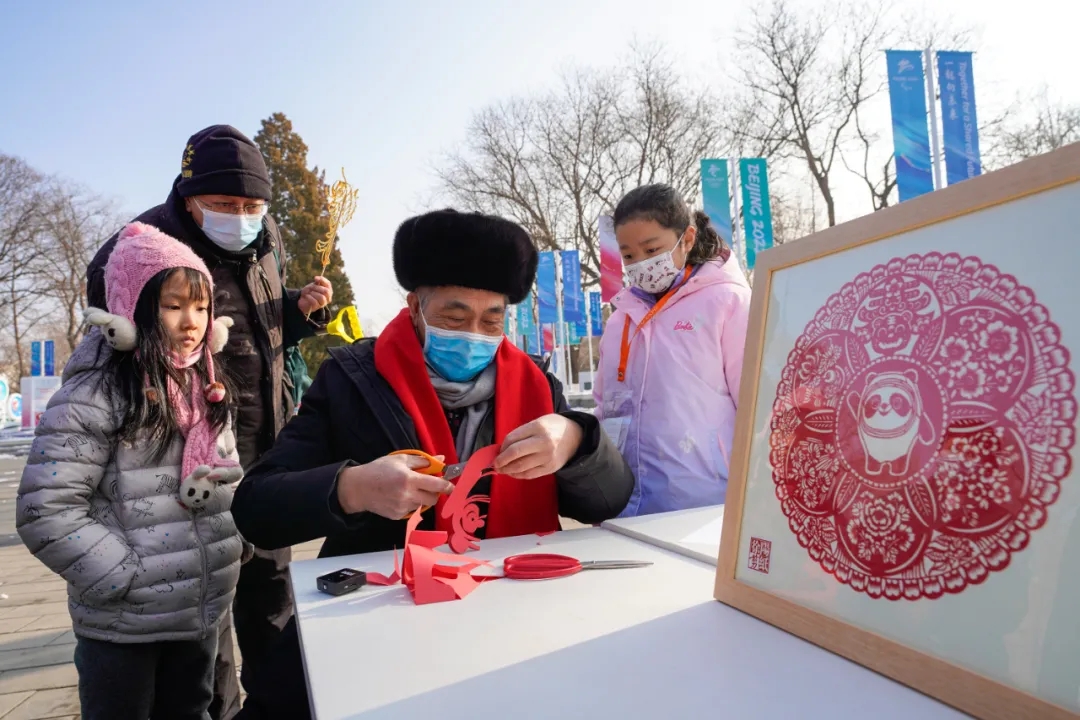 市民在东城区冬奥文化公园观看、体验剪纸艺术。东城区委宣传部供图 林萱/摄