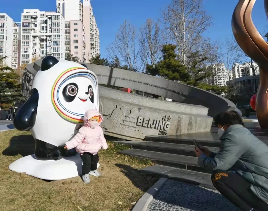 在东四奥林匹克社区公园,小朋友与“冰墩墩”合影留念。东城区委宣传部供图 贵彬/摄