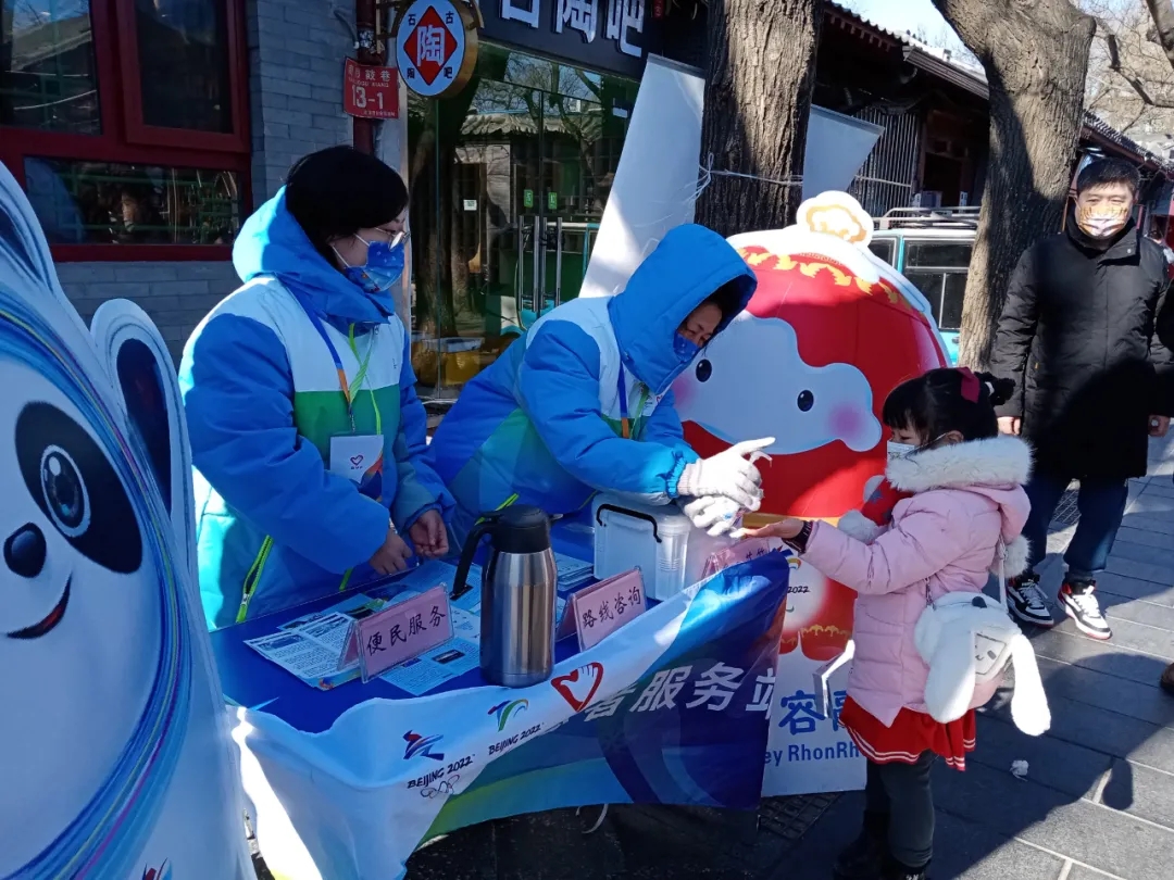 冬奥城市志愿者在东城区交道口街道“暖空间”志愿服务站为市民、游客服务。东城团区委供图