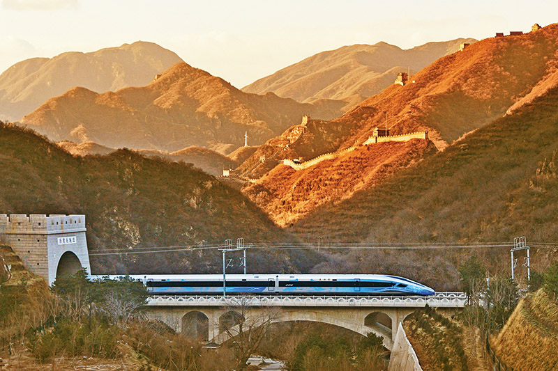 高铁是交通运输现代化的重要标志,也是一个国家工业化水平的重要体现。1909年,京张铁路建成;2019年,京张高铁通车。从自主设计修建零的突破到世界最先进水平,从时速35公里到350公里,京张线见证了中国铁路的发展,也见证了中国综合国力的飞跃。作为我国首条建成投用的智能高铁,京张高铁也是北京冬奥会的重要配套工程。图为2022年1月10日,北京冬奥列车在京张高铁居庸关长城附近运行。罗春晓/摄