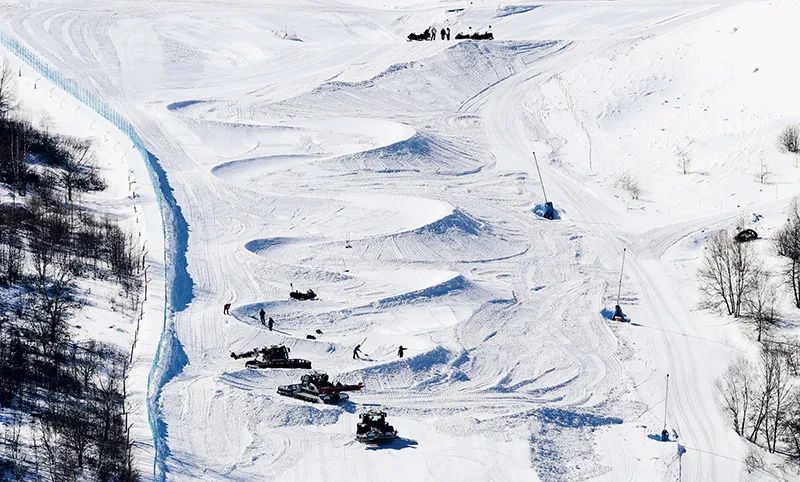 2022年2月23日,北京冬奥会刚刚落下帷幕,河北张家口赛区云顶场馆群迅速进入冬残奥会转换期,赛道二次塑型、张贴冬残奥标识、残奥景观布设等工作全面展开,备战即将到来的北京冬残奥会。这是工作人员在云顶滑雪公园进行赛道二次塑型作业。视觉中国 武殿森/摄