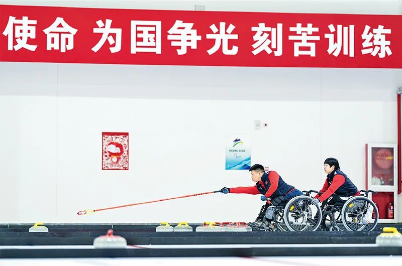 北京2022年冬残奥会将于3月4日开幕。这是2021年12月23日,在位于北京顺义的国家残疾人冰上运动比赛训练馆,中国轮椅冰壶队队员抓紧进行训练,为北京冬残奥会做最后的准备。新华社记者 才扬/摄