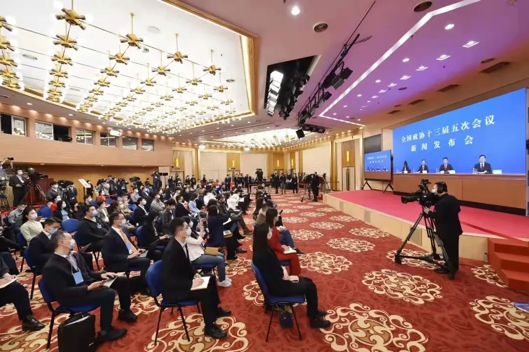 2022年3月3日,全国政协十三届五次会议新闻发布会在北京人民大会堂举行。为有效防控疫情,本次新闻发布会沿用前两年做法,采用网络视频的形式举行,主会场设在人民大会堂,分会场设在梅地亚中心。这是分会场。 新华社记者 陈钟昊/摄