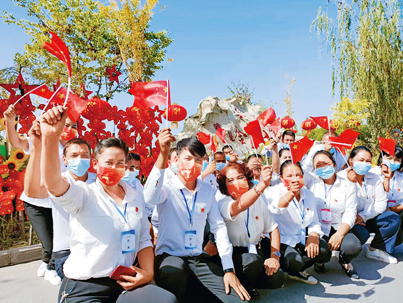 图为2021年9月30日,新疆温宿县克孜勒镇人大代表开展“我和国旗合个影”主题活动,表达对祖国的美好祝福,喜迎新中国成立72周年。新疆维吾尔自治区人大常委会供图