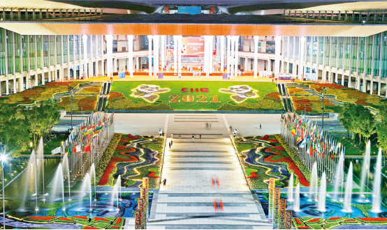 开放是当代中国的鲜明标识。习近平总书记在第四届中国国际进口博览会开幕式上发表主旨演讲强调,中国扩大高水平开放的决心不会变,同世界分享发展机遇的决心不会变,推动经济全球化朝着更加开放、包容、普惠、平衡、共赢方向发展的决心不会变。图为2021年11月2日晚,中国国际进口博览会场馆——国家会展中心(上海)南广场。 中新社记者 殷立勤/摄