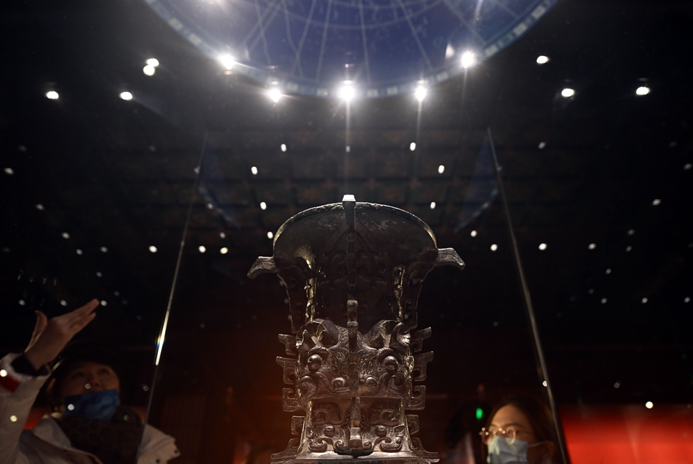 2022年1月25日,由国家文物局指导的“何以中国”展在北京故宫文渊阁开幕。本次展览共展出珍贵文物130余件(套),包括石器、陶瓷、玉器、青铜器、金银器等类别,分为“源”、“流”、“汇”三个单元。图为观众欣赏何尊。何尊是国家一级文物,是中国西周早期一个名叫何的西周宗室贵族所作的祭器。尊内底铸有12行、122字铭文,铭文中"宅兹中国",是目前所知"中国"一词的最早出现。 新华社记者 金良快/摄
