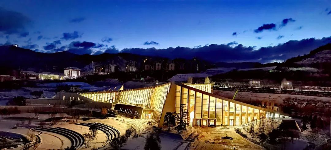崇礼冰雪博物馆是国内首家以冰雪和冬奥为主题的博物馆,也是北京2022年冬奥会赛后重要文化遗产项目之一。上图为博物馆夜景航拍,下图为博物馆建设场景。 中建集团供图