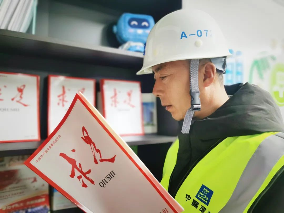 图为国家会议中心二期(配套)项目建设者利用休息时间阅读《求是》杂志。 中建集团供图