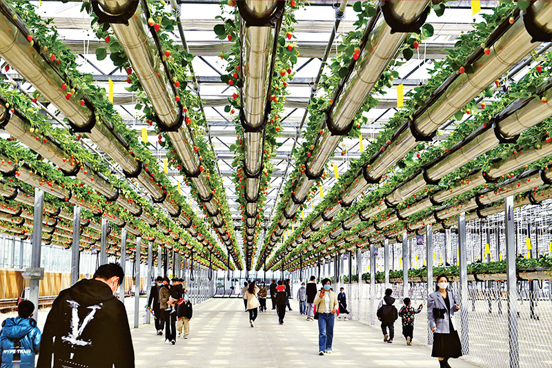 大力发展休闲观光农业,不断提升农业发展质量和效益,为全面推进乡村振兴注入新动能。图为2022年3月6日,游客在河南省商丘市夏邑县龙港湾智慧农业园空中草莓馆参观游玩。人民图片 苗育才/摄