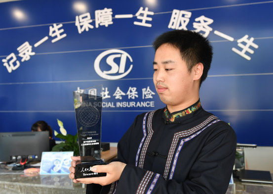 浙江景宁畲族自治县通过创新推出社保待遇资格“刷脸”认证,让群众足不出户通过手机即可办理,目前已有约3万人受益。图为一名畲族工作人员正在展示2017年度中国“互联网+”十大优秀案例奖杯。中国社会保障杂志社供图
