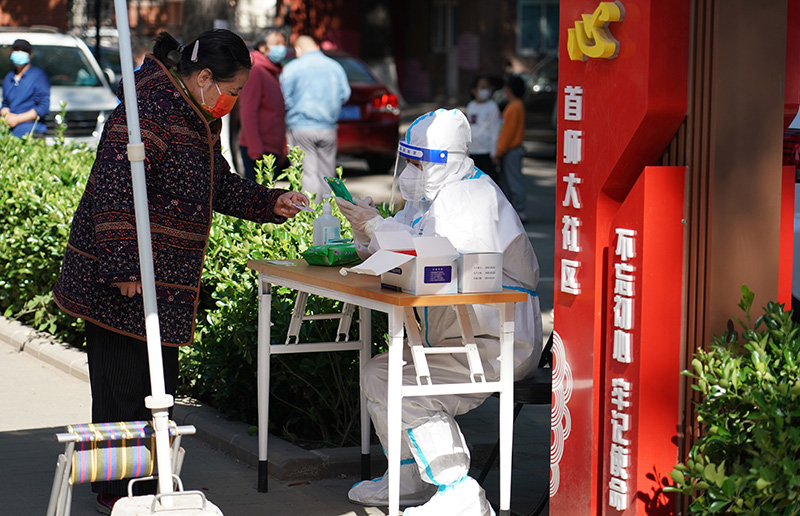 为尽快筛查出社会面隐匿病例,北京市从2022年5月13日开始,利用周末窗口期,连续三天在12个区开展三轮区域核酸筛查。图为5月13日,在北京市海淀区八里庄街道首师大社区的一处临时核酸检测采样点,工作人员登记市民信息。新华社记者 任超/摄