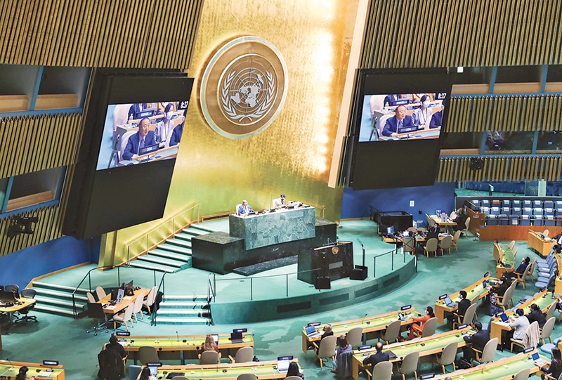 2021年10月7日,在位于纽约的联合国总部,中国常驻联合国代表张军(屏幕上)在第七十六届联合国大会第三委员会一般性辩论中发言。张军在发言中说,中国人民的幸福生活和开心笑容是中国人权状况的最好答案。新华社记者 王迎/摄